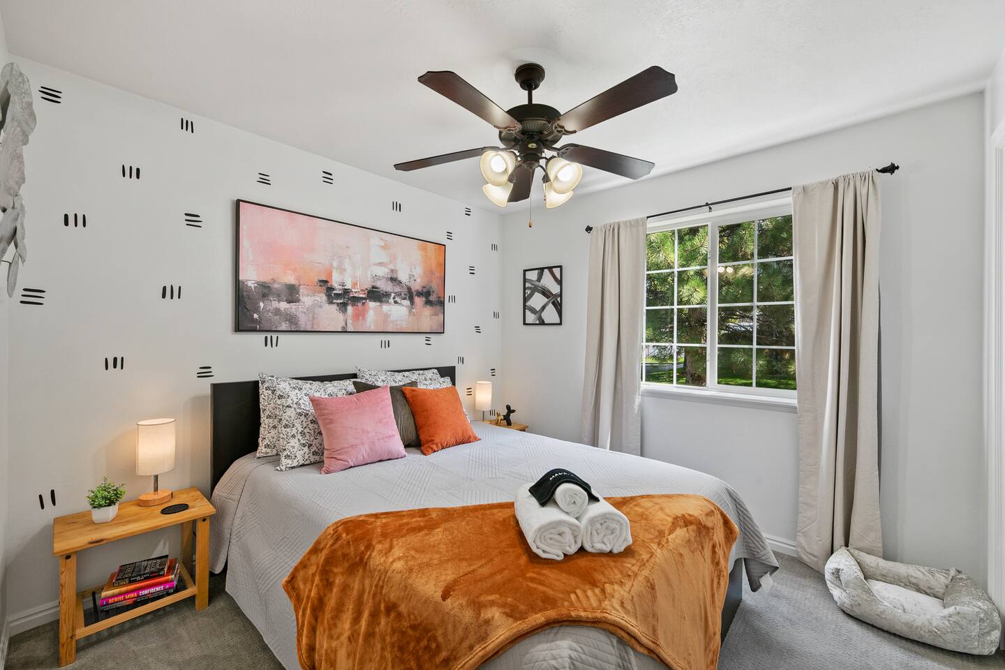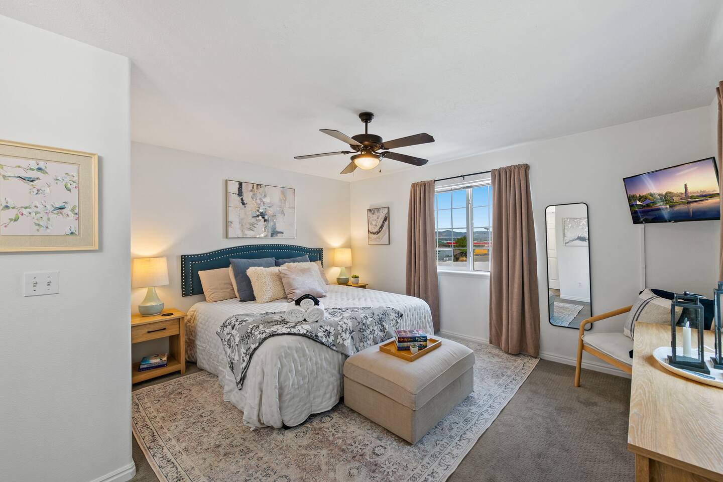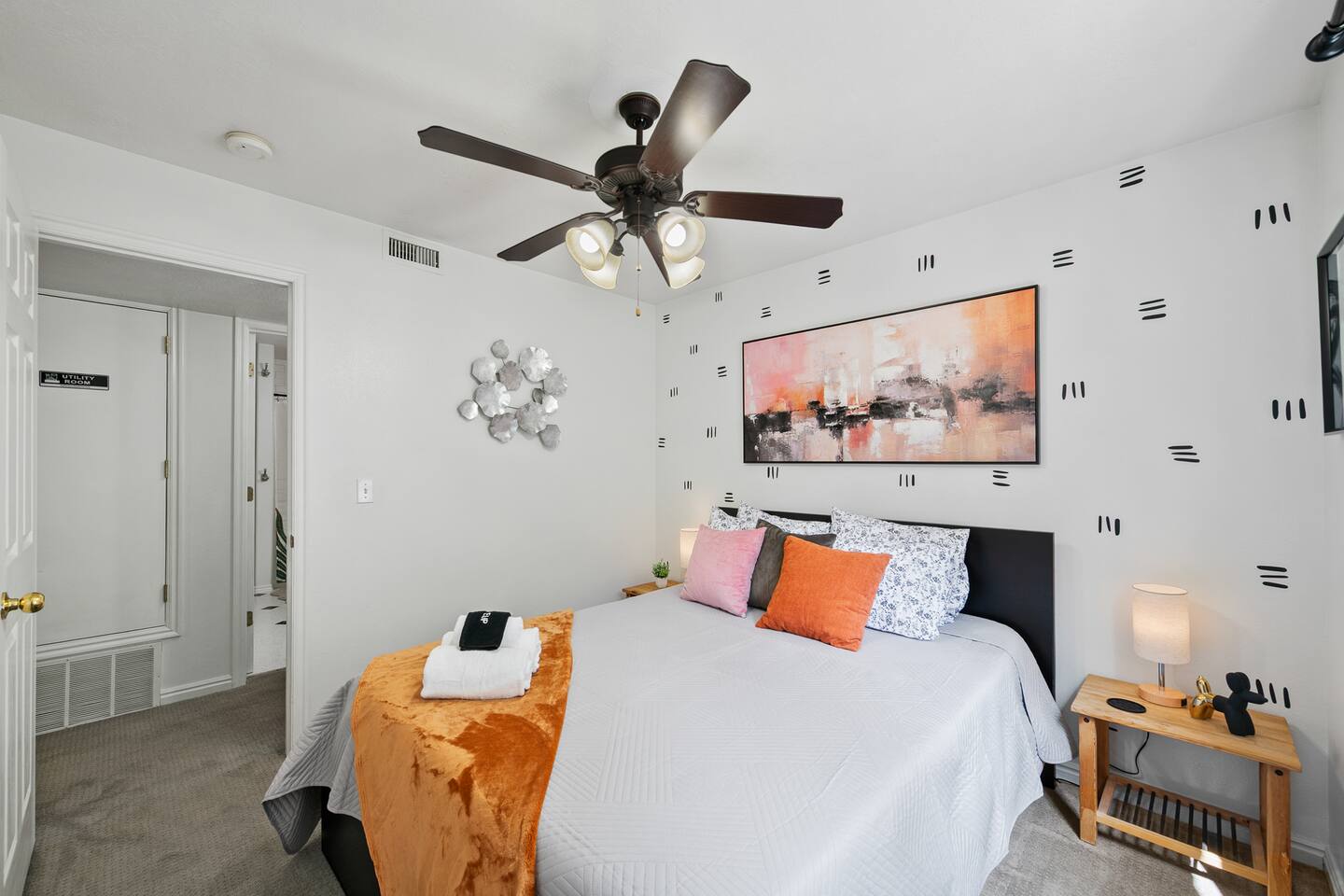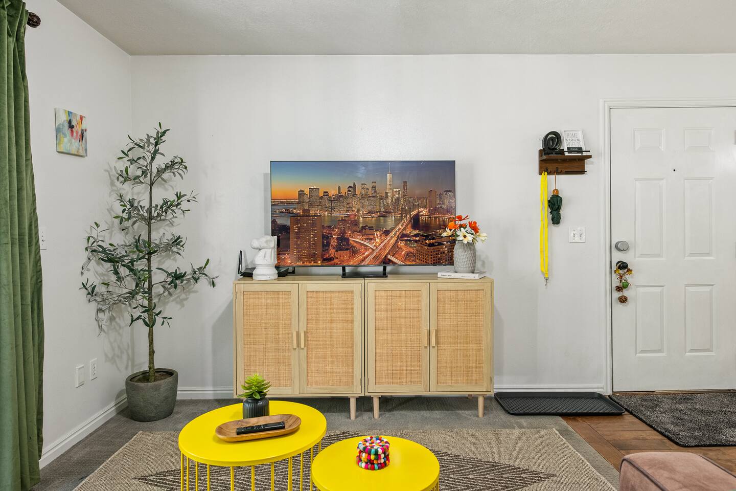 ✨ Bright, Cheerful, & Cozy ✨ Step inside this welcoming condo designed for travelers who want comfort, style, and convenience. The open layout is perfect for relaxing or entertaining — featuring a bright living room with plush seating, Smart TV, board games, and even a few instruments for impromptu jam sessions. Enjoy a morning coffee or evening glass of wine on the private patio with mountain views. 🍳 Fully Stocked Kitchen & Dining Cook like you’re at home in the thoughtfully equipped kitchen: ☀ Stove, oven & microwave ☀ Coffee station with fresh coffee beans, creamers, flavorings, teas, & grinder ☀ Pots, pans, bakeware, & spices ☀ Toaster, blender, & wine glasses ☀ Dishwasher & cleaning supplies ☀ Dining table with seating for 6 🛏 Comfortable & Flexible Sleeping Spaces Bedroom 1: King bed with plush bedding, spacious walk-in closet, bedside lamps, and a peaceful vibe — a true retreat after a day of exploring. Bedroom 2: Queen bed with premium linens, dresser, closet space, Smart TV, and blackout curtains for a restful night. Living Room: Brand-new queen pull-out sofa bed with extra linens — perfect for kids or extra guests. 🌟 Amenities You’ll Love ☀ Private outdoor patio with seating ☀ Free high-speed WiFi & Smart TVs ☀ Record player + records, guitar, piano, & games ☀ Washer/dryer with laundry essentials ☀ Central heating & air ☀ Fresh towels, linens & toiletries ☀ Work-friendly desk space ☀ Plenty of free parking ☀ Keyless self check-in 📍 Perfect Orem Location ☀ 5 mins to UVU, 10 mins to BYU ☀ Quick access to I-15 for Provo, Lehi & SLC ☀ Close to University Place, Provo Towne Centre, dining & entertainment ☀ Minutes from Provo Canyon, Bridal Veil Falls & Utah Lake ☀ 30 mins to Sundance Resort & skiing 🐾 Pet Friendly Furry friends are welcome with an additional fee of $15 per pet per night. In order to provide an excellent experience for all of our guests we allow responsible dog owners to bring WELL BEHAVED dogs (up to 2) during their stay. A deep cleaning is performed after each stay. Please crate your pet if you are leaving them alone in the property to avoid damages. Pets must be on a leash at all times while outside at the property. PLEASE NOTE: While you'll be staying in your own private condo, the building is shared with other residents-including neighbors below, above and on one side of you. You may occasionally hear everyday sounds like footsteps in the hallway or a dog barking nearby. We kindly ask that you be mindful of noise and considerate of those around you—just as we hope they’ll be for you! Book your stay today and enjoy a cozy, comfortable, convenient location, and all the thoughtful extras that make your trip unforgettable!