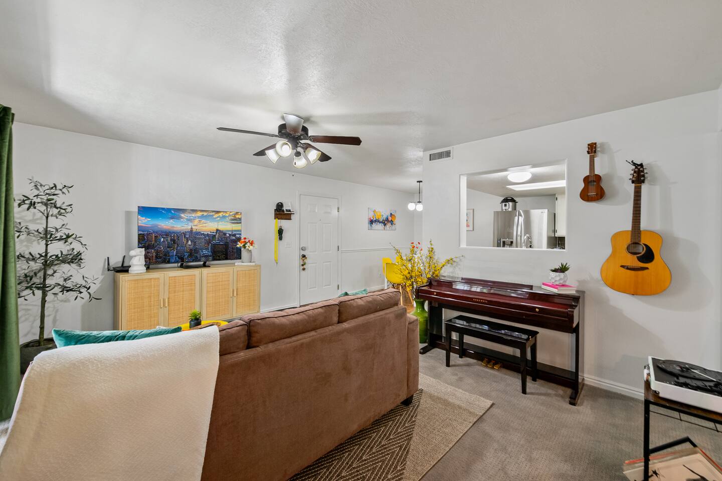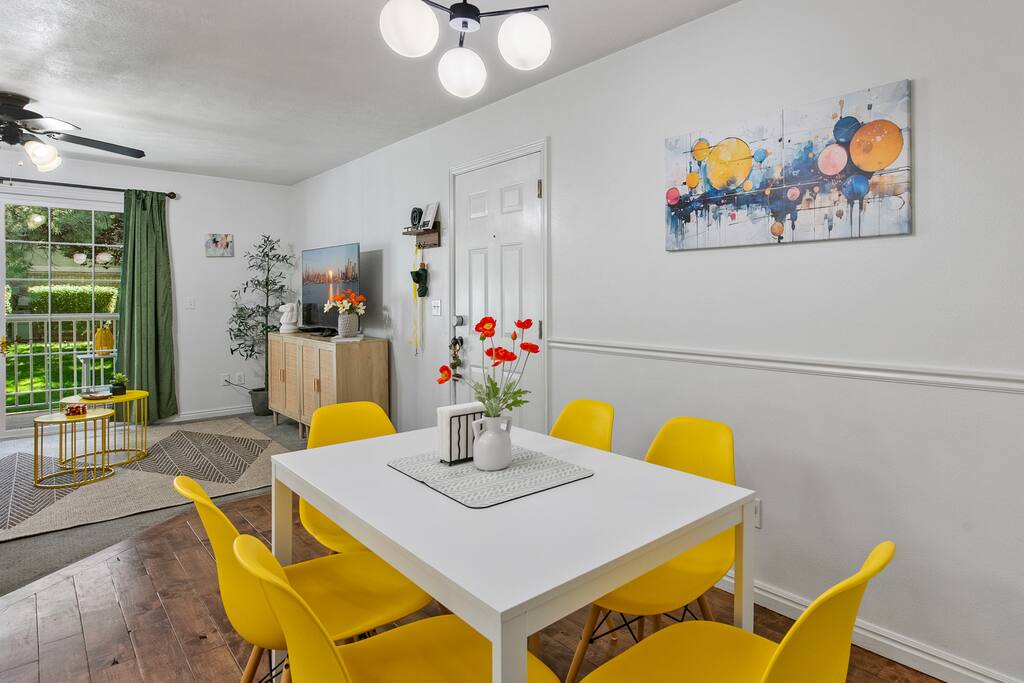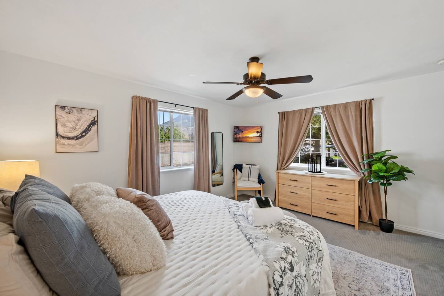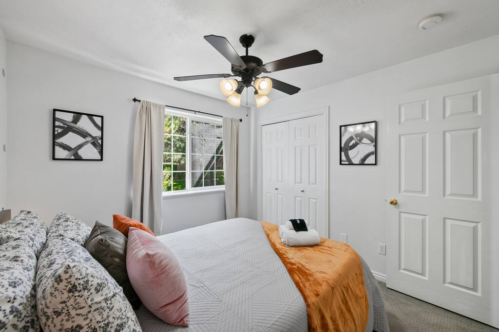 ✨ Bright, Cheerful, & Cozy ✨ Step inside this welcoming condo designed for travelers who want comfort, style, and convenience. The open layout is perfect for relaxing or entertaining — featuring a bright living room with plush seating, Smart TV, board games, and even a few instruments for impromptu jam sessions. Enjoy a morning coffee or evening glass of wine on the private patio with mountain views. 🍳 Fully Stocked Kitchen & Dining Cook like you’re at home in the thoughtfully equipped kitchen: ☀ Stove, oven & microwave ☀ Coffee station with fresh coffee beans, creamers, flavorings, teas, & grinder ☀ Pots, pans, bakeware, & spices ☀ Toaster, blender, & wine glasses ☀ Dishwasher & cleaning supplies ☀ Dining table with seating for 6 🛏 Comfortable & Flexible Sleeping Spaces Bedroom 1: King bed with plush bedding, spacious walk-in closet, bedside lamps, and a peaceful vibe — a true retreat after a day of exploring. Bedroom 2: Queen bed with premium linens, dresser, closet space, Smart TV, and blackout curtains for a restful night. Living Room: Brand-new queen pull-out sofa bed with extra linens — perfect for kids or extra guests. 🌟 Amenities You’ll Love ☀ Private outdoor patio with seating ☀ Free high-speed WiFi & Smart TVs ☀ Record player + records, guitar, piano, & games ☀ Washer/dryer with laundry essentials ☀ Central heating & air ☀ Fresh towels, linens & toiletries ☀ Work-friendly desk space ☀ Plenty of free parking ☀ Keyless self check-in 📍 Perfect Orem Location ☀ 5 mins to UVU, 10 mins to BYU ☀ Quick access to I-15 for Provo, Lehi & SLC ☀ Close to University Place, Provo Towne Centre, dining & entertainment ☀ Minutes from Provo Canyon, Bridal Veil Falls & Utah Lake ☀ 30 mins to Sundance Resort & skiing 🐾 Pet Friendly Furry friends are welcome with an additional fee of $15 per pet per night. In order to provide an excellent experience for all of our guests we allow responsible dog owners to bring WELL BEHAVED dogs (up to 2) during their stay. A deep cleaning is performed after each stay. Please crate your pet if you are leaving them alone in the property to avoid damages. Pets must be on a leash at all times while outside at the property. PLEASE NOTE: While you'll be staying in your own private condo, the building is shared with other residents-including neighbors below, above and on one side of you. You may occasionally hear everyday sounds like footsteps in the hallway or a dog barking nearby. We kindly ask that you be mindful of noise and considerate of those around you—just as we hope they’ll be for you! Book your stay today and enjoy a cozy, comfortable, convenient location, and all the thoughtful extras that make your trip unforgettable!