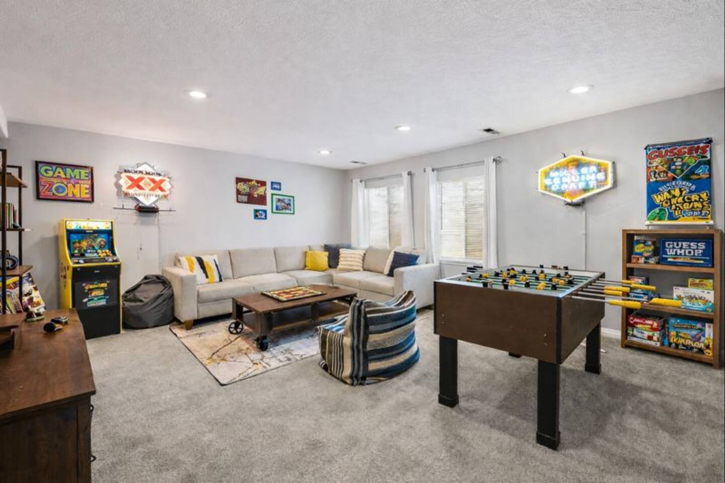 This gorgeous private home is just blocks from dining, parks, breweries, shopping, sightseeing, museums, and more! * 1.2 miles (2 minutes) to nearest EV Charging Station * 3 miles (5 minutes) to Jordan River Parkway Trail * 6 miles (8 minutes) to Loveland Living Planet Aquarium * 18 miles (22 minutes) to the Airport * 16 miles (20 minutes) to Downtown Salt Lake City * 28 miles (30-45 minutes) to Park City, Snowbird, and Brighton Ski Resorts ✔ Fully Equipped Kitchen ✔ Dining Room with table and chairs for 10 ✔ Lounge Area with a chaise lounge, chairs, bar area, and record player ✔ 4 Ultra-Comfy Bedrooms with blackout curtains and sound machines ✔ High-Speed Wi-Fi ✔ Game and Family Room with sectional, 65” Smart TV, foosball table, arcade, video games, board games, and books ✔ Free Private Garage Parking (2 spots) ★ KITCHEN ★ Equipped with state-of-the-art cooking appliances and suitable for preparation of any meal. ✔ Microwave ✔ Stove ✔ Oven ✔ Refrigerator/Freezer w/ Filtered Water & Ice Maker ✔ Keurig Coffee Maker w/ Coffee Pods, Creamer, Sugar, & Flavoring ✔ Sink - Hot & Cold Water ✔ Glasses ✔ Silverware ✔ Dinnerware ✔ Pots & Pans ✔ Assorted Spices & Olive Oil Kids ✔ High Chair ✔ Pack N Play ✔ Utensils and Dishes ★ BEDROOMS ★ After an exciting day of exploring and adventuring throughout Salt Lake, relax in one of our 4 luxurious bedrooms. We designed them with your comfort in mind. ♛ BEDROOM 1 *UPSTAIRS ✔ King-Size Bed with Pillows, Linens, and Blankets ✔ Wardrobe with Hangers, Shelves, and Dresser ✔ Night Stands with Reading Lamps, Sound Machine, and Phone Charger ✔ 55" Smart TV ✔ Blackout Curtains ✔ Sitting Area with Table ♛ BEDROOM 2 *UPSTAIRS ✔ Queen Bed with Pillows, Linens, and Blankets ✔ Wardrobe with Hangers, Shelves, and Dresser ✔ Night Stand with Reading Lamp, Sound Machine, and Phone Charger ✔ 32" Smart TV ✔ Blackout Curtains ♛ BEDROOM 3 *MAIN LEVEL ✔ Full over Full Bunkbed and Pullout Twin Trundle with Pillows, Linens, & Blankets ✔ Wardrobe with Hangers, Shelves, and Dresser ✔ 32" Smart TV ✔ Blackout Curtains ✔ Reading Nook with Books ♛ BEDROOM 4 *DOWNSTAIRS ✔ Queen Bed with Pillows, Linens, and Blankets ✔ Wardrobe with Hangers, Shelves, and Dresser ✔ Night Stand with Reading Lamp, Sound Machine, and Phone Charger ✔ Blackout Curtains ★ BATHROOM 1 *UPSTAIRS MASTER ✔ Double Wash Basins ✔ Garden Tub ✔ Separate Enclosed Shower ✔ Mirror ✔ Toilet ✔ Towels ✔ Essential Toiletries ( Shampoo, Conditioner, Body Wash and Hand Soap) ✔ Hair Dryer ★ BATHROOM 2 *UPSTAIRS ✔ Wash Basin ✔ Shower and Bathtub ✔ Mirror ✔ Toilet ✔ Towels ✔ Essential Toiletries ( Shampoo, Conditioner, Body Wash and Hand Soap) ✔ Hair Dryer ★ BATHROOM 2 *MAIN LEVEL ✔ Wash Basin ✔ Enclosed Shower ✔ Mirror ✔ Toilet ✔ Towels ✔ Essential Toiletries ( Shampoo, Conditioner, Body Wash and Hand Soap) ✔ Hair Dryer ★ BATHROOM 2 *DOWNSTAIRS ✔ Wash Basin ✔ Enclosed Shower ✔ Mirror ✔ Toilet ✔ Towels ✔ Essential Toiletries ( Shampoo, Conditioner, Body Wash and Hand Soap) ✔ Hair Dryer OFFICE *UPSTAIRS ✔ L-Shaped Desk ✔ Large Comfy Chair ✔ Charging Lamp and Writing Tools GAME & LIVING ROOM *DOWNSTAIRS ✔ Foosball Table ✔ Street Fighter Arcade Game ✔ 65” Smart TV ✔ Sleeper Sectional for Additional Sleeping ✔ Pillows, Sheets, and Blankets for Sleeper ✔ Board Games ✔ Electric Fireplace ★ LOUNGE AREA ★ MAIN LEVEL Sit-back and create memorable moments with family and friends, or just relax, craft a cocktail, and listen to your favorite record. Colorful décor livens up the atmosphere in this unique space. ✔ Comfortable Chaise Lounger and Chairs ✔ Record Player ✔ Access to the Patio ✔ Dog Bed, Toys, Dishes, and Poop Bags FULLY FENCED PRIVATE BACKYARD ✔ BBQ Grill ✔ Outdoor Couch and Chairs ✔ Firepit Table ✔ Bistro Lighting GARAGE ✔ 2 Parking Spaces (Small to Medium Vehicles) ✔ Clearance of 7.5 feet in height PLEASE NOTE: There is a shared driveway leading to the property, so NO PARKING IN THE DRIVEWAY. There is additional overnight parking for a fee of $30 per stay required by the HOA. OTHER AMMENITIES INCLUDE: ✔ High-Speed Wi-Fi ✔Central Air Conditioning ✔ Washer/Dryer ✔ Iron and Ironing Board ✔ Yoga Equipment ✔ Public Playground ✔ Public Outdoor Seasonal Swimming Pool (Labor Day-Memorial Day) Our fenced in backyard makes it perfect for furry friends which are welcome with an additional fee. In order to provide an excellent experience for all of our guests we allow responsible dog owners to bring WELL BEHAVED dogs (up to 3) during their stay. A deep cleaning is performed after each pet stay, and we charge $15 per pet per night.